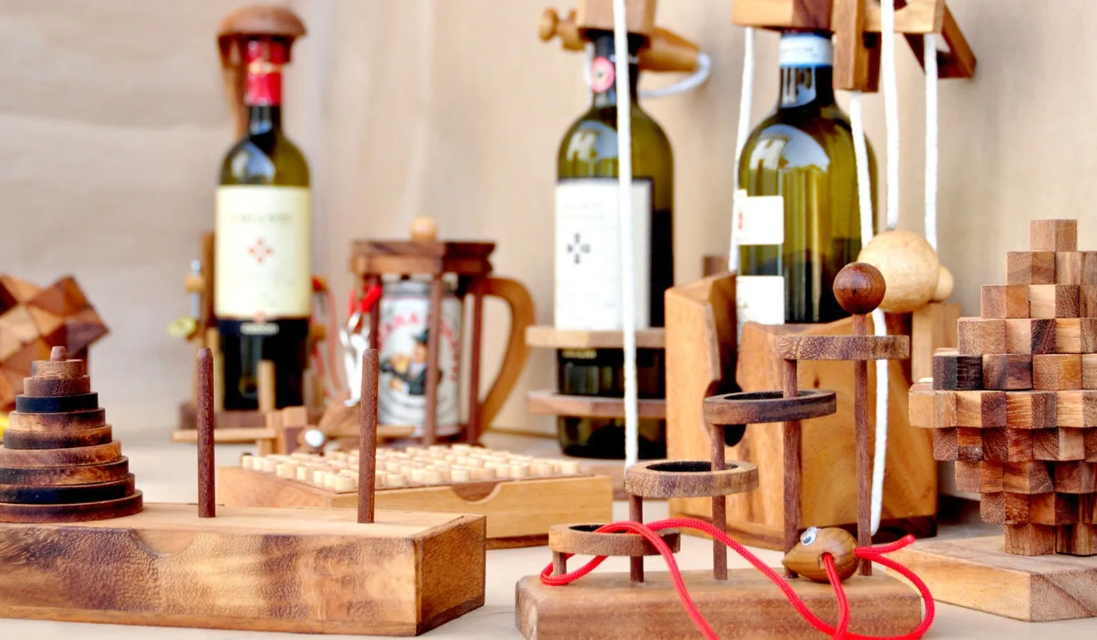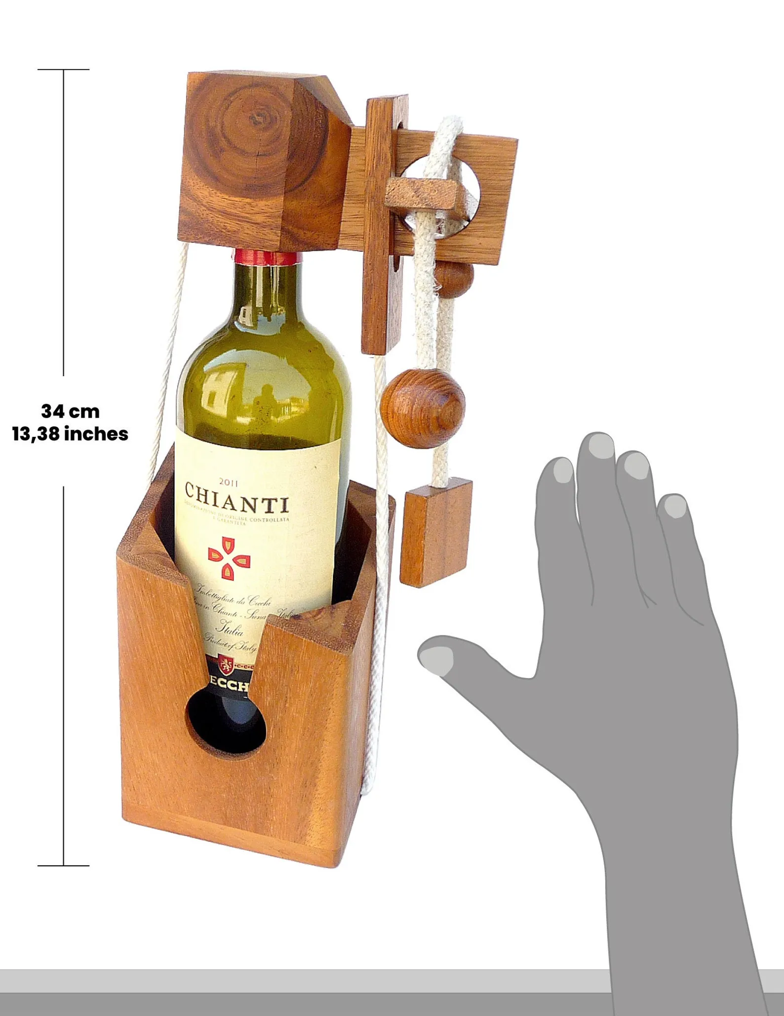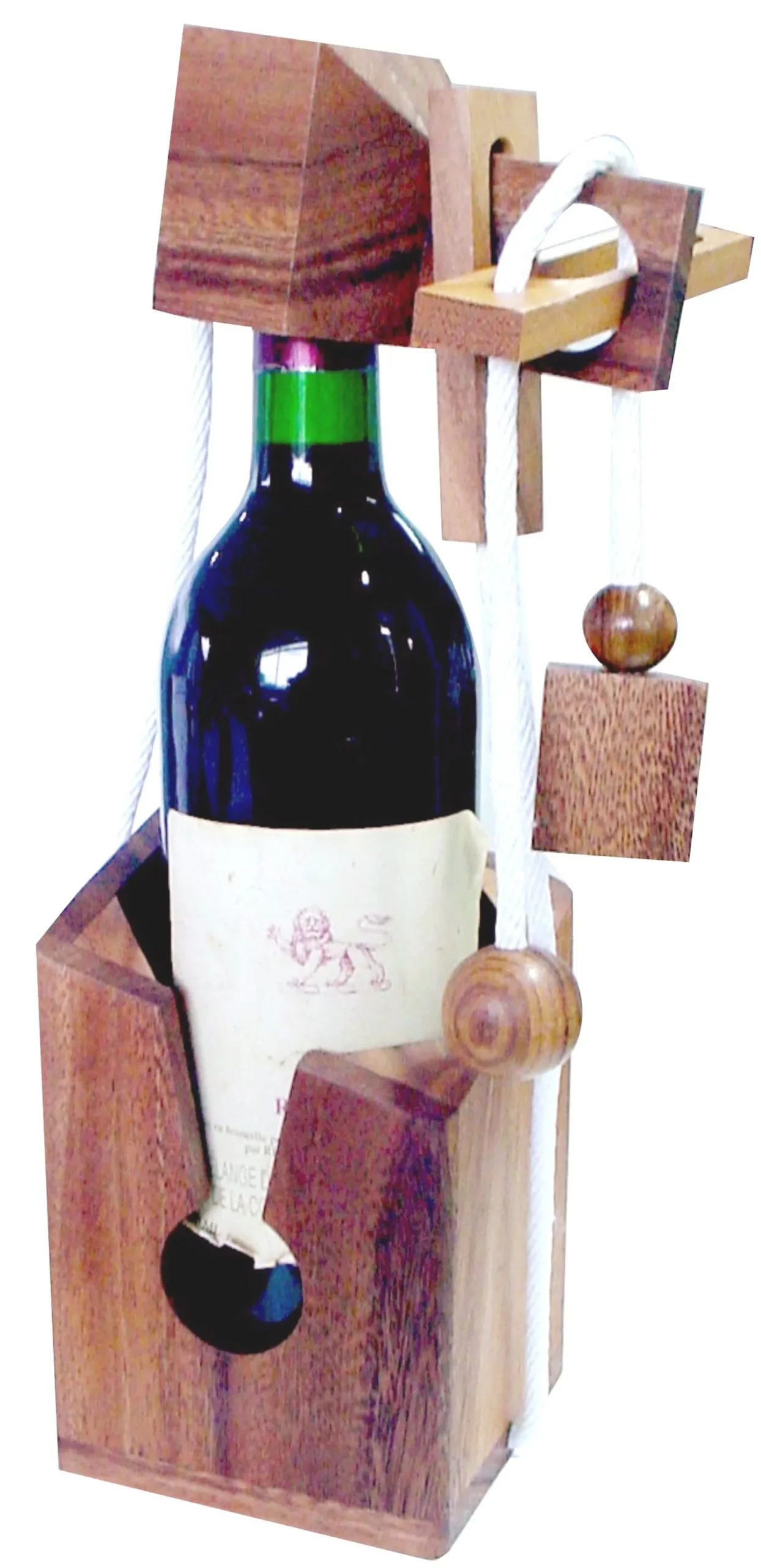 Wooden Wine Bottle Holder Logic Puzzle Display Stand is a combined display and brain teaser for a single bottle. The stand is constructed from wood pieces and cords that hold the bottle securely when arranged correctly. At first glance the setup looks improbable, which naturally invites curiosity from guests and family members.